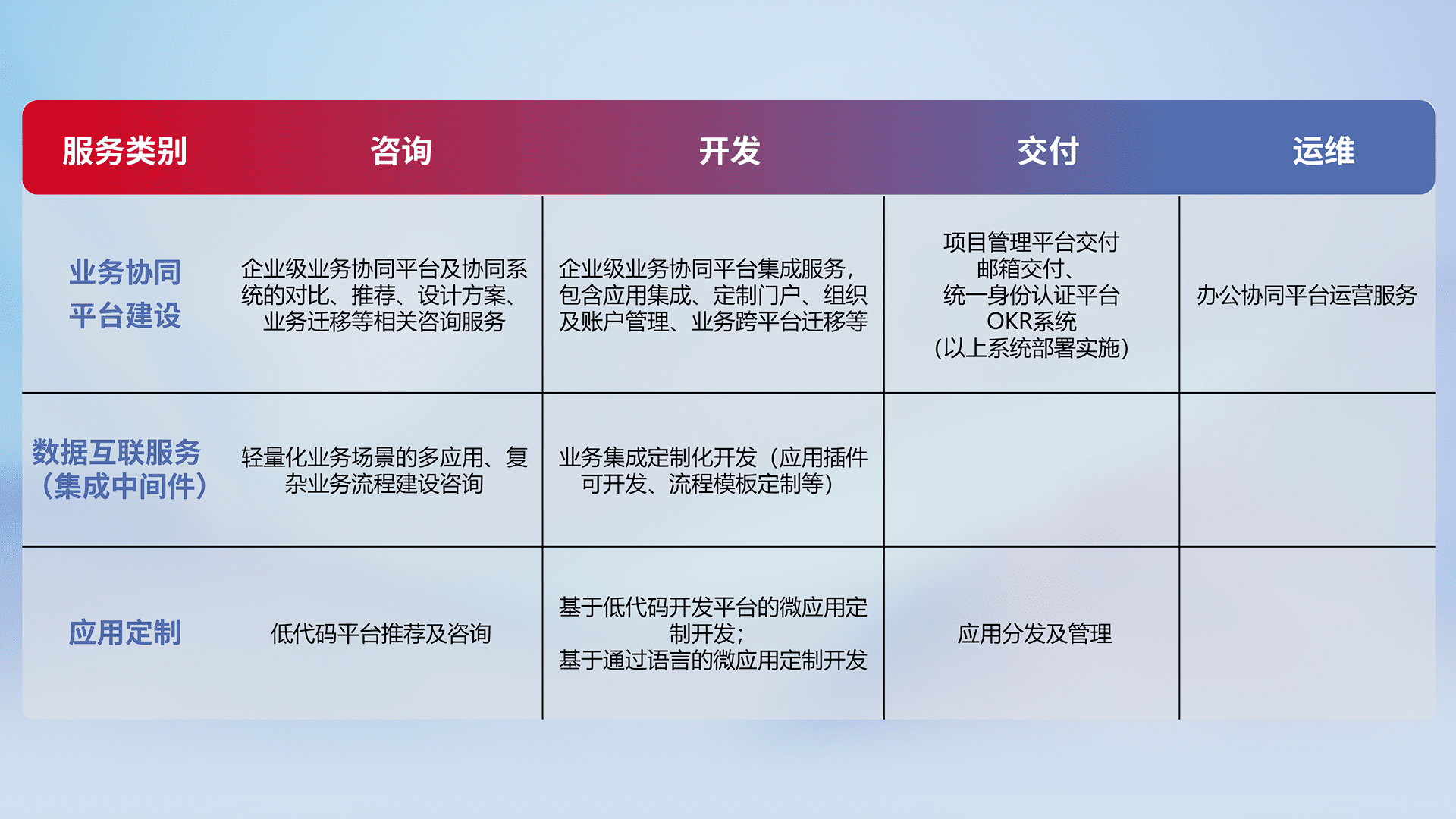 针对钉钉、、企微、、、、IDaas等平台级产品提供产品的规划、、、方案、、、交付、、、、定制化开发等服务,,,,实现如统一协同办公、、、智能客户服务、、、、混合会议管理、、、智能数据查询、、等业务场景,,,,实现数字化转型。。。
